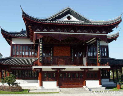 过“福寿桥”,经“环秀桥”,展现在我们面前的是新建的大戏台。大戏台宽9米,深7米,上方有一澡井,其中雕刻是由四百多只飞鸟组成,金光闪闪;那末戏台上方为什么要造这样一只工艺复杂、精雕细刻的澡井呢?这除了用以装饰之外,还可起到扩音的作用,要知道古时候戏台是没有麦克风扩音设备的。在大戏台的楼上展示着由安徽张正先生创意、上海天趣艺术品有限公司设计、创作的大型根雕作品,这已评为大世界基尼斯之最,数以百计的根雕作品均以神话传说题材为主,人物形象活灵活现,呼之欲出。其中“八仙过海”、“寿比南山”、“孙吾空吹毛点兵”等堪称极晶。