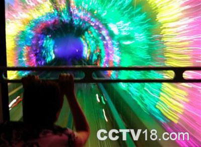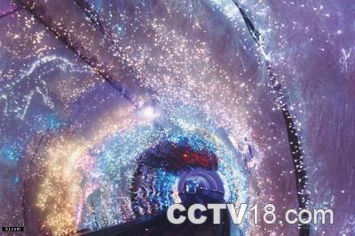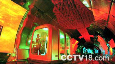 首先经过的是“时光隧道区”。隧道壁上破裂的铝板、探索器撞击地面的巨响,表明我们钻入地层,进入科幻空间。在“漩涡区”,光波飞速倒退,光纤闪亮,化作一个绚丽的漩涡。随后见到,洞壁上模拟岩石实景,辅以迷幻的灯景,探索器正在穿透岩石层,这是“穿梭区”。