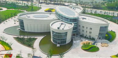 整座大楼因五个椭圆而分为五个主要区域。中间部分为大堂,以8米高的大型石材浅浮雕《青龙赋》为主题背景,庄重而典雅,是为观众提供服务和休息的公共场地。