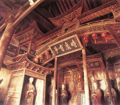 九仙女祠:九仙女祠是个四合小院,祠角有悬空阁楼一座,山门外紧接着依崖旋转的走廊百余间,由上而下,为登山进祠的唯一通道。九仙女祠面南而筑,门口悬一大钟,钟径一米有余,庙中正殿为三教掌殿,东西为厢房,东厢有一套间,为暗室,无窗户,与普通房子无异。西厢房为两间间东西都无塑像。正殿西山墙有一四尺余宽的胡同,穿过胡同,便是九仙女殿,殿宽2米左右。殿中所塑十一尊像,正中为母像,两旁各塑五像,其中九个仙女皆面向一边,唯一女子看视母亲,雕塑工艺精巧,生动美观。