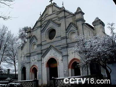 位于美兴镇政府街东部的天主教堂,是法国传教士佘廉霭于民国8年(1919年)组织兴建。整座建筑用砖、石、木作材料,中式结构,西式造型,坐西向东,四合院落布局,由经堂、东侧厅堂、北侧厢房三部分组成。经堂占地973平方米(现拆除),正面为青砖砌筑,“金字塔”造型,有六根砖砌凸柱,正面通高12.58米,两侧高7.58米,墙壁上砖砌有基督、十字架及各种几何图型装饰,有三道卷拱门。左右两墙均开有五扇西洋式卷拱窗,北侧过道尾部有一小门,南侧过道尾部有一假门。经堂室内宽阔,当心间为穹隆式望板,两侧之间为平面望板,面阔五间13.7米,进深五间26.1米,尽头设有讲经台,每逢教民聚会,传教士布道讲经。室内有大木柱十根,柱基为八棱鼓形石柱,柱顶上有叶形浮雕装饰。