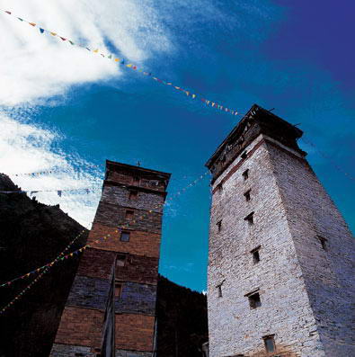 九层弥勒佛塔可谓佛像展览馆,里面陈列着各种佛像,有壁画、唐卡画、泥塑像、金属塑像。最令人刺激的是第九层佛塔外悬空转一圈。第九层佛塔墙外,每一方有一行从墙壁伸出的石板,长度大约20厘米,恰好一个脚板放在上面。探险者从塔门出来,手扶塔身,踏着这行悬空的石板移动脚步,围佛塔转上一圈。为了以防万一。僧人在佛塔身上牵了一圈钢绳作为扶手。尽管这样,还是令人提心吊胆。