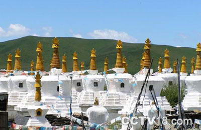 经幡是藏区普遍存在的一种图腾,它是在布、麻织品上书写经文,然后将其插在山巅、路口、河边等地,其意义为用自然之力来诵经,以保平安吉祥。经幡在藏区的插法各地也不尽相同,红原瓦切的经幡是围成-顶园帐蓬似的,而且瓦切经幡群面积之大也为藏区所少见。在经幡群旁边还有一片白塔和转经筒,常有藏胞在此转塔、转经。