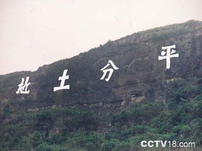 “平分土地”刻在九子坡佛尔崖上,西距通江县城30公里,车临洪口12公里,字高5.7米,宽4.9米,笔划深0.1米。