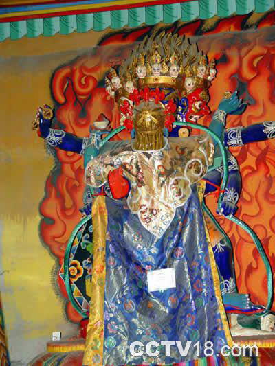 大殿里面供奉着佛祖释迦牟尼和黄教创始人宗喀巴的佛像,万余尊的泥塑小佛像,在殿内沿着墙壁陈列开去,使噶登彭德林寺的大殿成了名副其实的万佛殿。一幅幅描画着佛像的唐卡画在大殿的顶梁上高悬下来,接受着朝拜者的敬仰。幽暗中,闪烁的酥油灯虽然是星星点点,但却把巴塘人的心灵照耀得格外亮堂。此时的噶登彭德林寺是宁静的,静得让人能够听见酥油灯静悄悄燃烧的声音。从大殿出来上到二层一间小殿内,里面供奉着释迦牟尼的七岁等身像,巴塘人将这尊用檀香木雕成的佛像叫作“松觉扎玛”。寺庙特地在佛像的旁边置放了一架小梯,供信徒上前嗅闻它的檀香气息,接受佛光的洗浴。关于这尊“松觉扎玛”,巴塘的民间传说最初是由噶举派创始人玛尔巴从印度带来,送给当年的木氏土司,后来安放在虎头山上的丹戈寺里,在寺庙频繁的迁移中,“松觉扎玛”曾经神秘地消失。后来一个巴塘农妇到丹戈寺的遗址上去挖红泥修建房屋,从土里传出“哎哟”的呻吟声,后来又听到了“向左挖”、“向右挖”的恳求声。农妇此时朝四周看了又看,山上并没有旁人,于是她急忙下山向人们告知了这件事。于是,噶登彭德林寺和当时的土司一起派人前去挖掘,就挖出了这尊“松觉扎玛”。但此后土司和噶登彭德林寺又为佛像的归属发生了争执,最终双方达成协议,既然“松觉扎玛”能开口讲话,那就由它自己来选择何去何从。他们将佛像临时供奉在一顶帐篷里,双方都派人监护,并言定第二天佛像要是面向土司的官寨,佛像就归土司所有,如佛像面向噶登彭德林寺,此后就由噶登彭德林寺供奉。经过寺庙喇嘛们一夜的颂经祈祷,第二天,这尊“松觉扎玛”果真面向的是噶登彭德林寺的方向,于是,佛像就被迎送到了噶登彭德林寺的大殿内供奉。