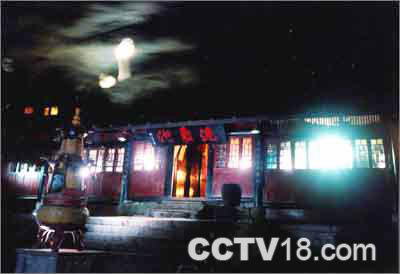 每当月夜,云收雾敛,遥天一碧,万山沉寂,秋风送爽,一轮明镜斜嵌在洁净无云的蓝空上,唯有英姿挺拔的冷杉树林,萧萧瑟瑟,低吟轻语。月光透过茂密墨绿的丛林,大雄殿、半月台、洗象池、初喜亭、吟月楼,沉浸在朦朦的月色里,肃穆,活静。月光下,古刹似一侧卧的大象头,蓝天映衬,剪影清晰:大殿似额头,两侧厢房似双耳,半月台下的钻天坡石阶,又好似拖长的象鼻,不知是巧合,还是寺庙设计师的匠心独具?
