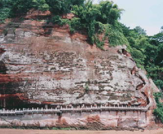 大佛右侧的石壁上,有一条险峻的栈道,自上而下盘旋九曲,这便是著名的“九曲栈道”,是与修建佛像同时开凿的。栈道顶端有一长廊式亭阁,这是明代袁子让称作“立亭上则三峨凝黛,水自天来,烟波极目,绿野无际”的近河亭。栈道第一折的经变图雕刻精细,形象生动,人物丰腴端祥,线条优美,并刻有楼台亭塔,是研究唐代建筑和石刻艺术的宝贵资料。