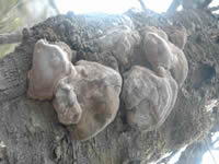 在桫椤峡谷谷首的一侧,有一奇异的崖壁,宽约1000米,高约100米,灰白色,似一堵墙陡 立于峡谷。在崖壁的中心位置,有一口约1?1米见方的石洞。顺着崖壁垂下的藤条攀援而上,可进洞里。洞深4?5米,高2米,宽3米,非常干燥干净,似有石凳、石桌等人居痕迹。有人 在风雨雷电之夜,看见洞口两侧的崖壁上两只灵芝闪闪发光,因此这段崖壁被称作“灵芝崖”。笔者探访谷内,看见靠灵芝崖的一侧桫椤长得十分茂盛,而另一侧却不长桫椤。灵芝崖 所处的峡谷口有“落音沱”,每当大雨来临之前,就见白雾升腾,阳光映照下,升起一道彩 虹。据说,整个峡谷就这里的氧含量和负离子含量最高。