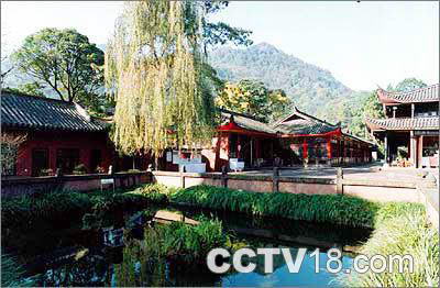 万年寺,晋时名普贤寺,唐改为白水寺,宋为白水普贤寺,明万历年间又改名圣寿万年寺。“白水为万年寺的代称。“寺幽名白水,金碧绚中天。池面临三四,峰头对百千。”(方孝孺《白水寺》)寺内一池,名白水池,传为、唐李白听蜀僧浚弹琴处。李白在《听蜀僧浚弹琴》诗中云:“蜀僧抱绿绮,西下峨眉峰。为我一挥手,如听万壑松。客心洗流水,余响入霜钟。不觉碧山暮,秋云暗几重。”池内蛙鸣如琴,民间传说是蛙学得僧浚弹琴的高手妙法。万年寺的山景四季宜人,尤其是在秋天。每逢金秋,峨眉山下夏暑尚存,金顶三峰已初飘白雪,而位于中山地区的万年古刹,正处在一年中的黄金季节。