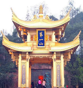 第一山亭,位于低山游览区中心,展示了丰富而深厚的峨眉山文化底蕴,表现了峨眉山宏大气势与宽阔胸襟,是峨眉山古今文化的缩影,是中国目前最大的铜亭,也是游客步行入山的起点。游客进入“天下名山”牌坊后,首先步入眼帘的就是气势雄伟的“第一山亭”,亭上“第一山”三个大字熠熠生辉。亭高16.1米,重檐翘角,精工巧构,气宇轩昂,金碧辉煌。亭四匾分别为“第一山”(出自宝掌和尚语:“高出五岳,秀甲九州,震旦第一山也”);、“峨眉山”、“大光明山”(出自佛教《华严经》“善财童子伫立妙高峰上,观此山如满月,大放光明”)、“皇人之山”(出自《山海经•西山经》和《三皇经》),代表着峨眉山在中国名山以及佛教、道教中的显著地位。
