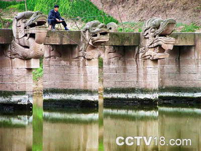 龙脑桥为东西走向,东西两面各3座桥墩,均为素面无雕刻,中部跨河水面的8座桥墩首部(朝向上游一端),分别雕刻古代民间传说的吉祥走兽,有四条龙,两个麒麟,一只青狮和一只白象,这样的布局,是全国罕见的独特之处。其排列构思好,悦目自然,给人以气宇轩昂之感。