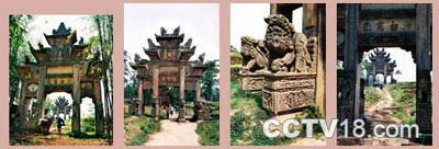 双石牌坊,位于仁寿县城东南部50余公里的禾加区中华乡牌坊村,距牌坊村小学东方200米,南北向,两坊上下对列,一条南北走向的石板大道贯穿其间。两坊间距44.5米,依所处地势由低到高分别编为一号坊和二号坊。
