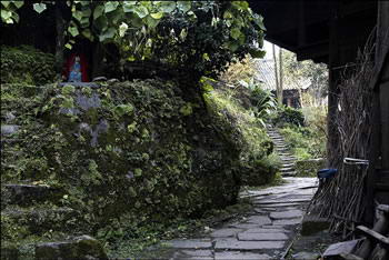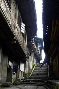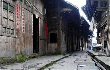 镇之街市,就建筑在二水夹流间之坡地上,梯级聚落,分上街、下街、横街,石级踏道联接下街与横街,构成一个“口”字形场镇,两河进入场镇由铁索桥两道,飞架河上联通,与自然地貌成为“火”字形,加上场镇街市之“口”字,遂为“谷”字,雅然天成。