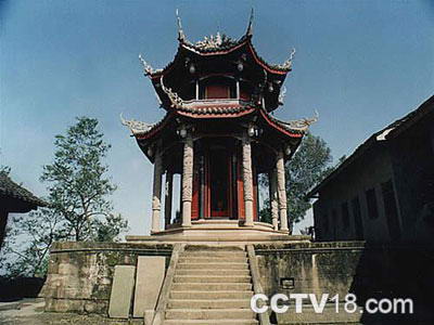 真武宫正殿背面,与真武祖师一壁之隔,塑的是“慈航真人”,也就是人们熟悉的观音菩萨。真武宫后面穿过院坝是一小台地,比院坝高出三米,实是凌云山的峰巅所在。据说台上原建有观音殿,不知毁于何时。近年在上面修了一座八角亭,画栋雕梁,古古朴典雅。亭中石雕:老子骑青 在云雾中行进,须眉皆白、安祥有神,造型精美。亭周有八根石柱支撑,每柱高四米,浮雕流抱柱。工艺精细。