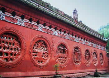 资中文庙照壁建于清同治年间,长19.5米,高6米,壁间7孔直径1.7米圆形镂空雕塑,图案为“云海波涛”、“蟹虾鱼龙”、“水宫龙府”、“亭塔园林”、“鹰翔鱼跃”、“龙凤呈祥”、“鱼跃龙门”等故事,寓意古代士子如江河中的鱼,只有不断努力进取,经尊孔尊儒的教化,最终方能跳过龙门。