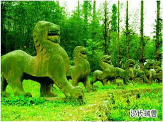 1、樊敏墓前神兽二具(镌刻于公元205年),均高1.45米,长2米,宽0.63米。一具为雄性,前爪抚蟾蜍;一具为雌性,前爪抚蟹。二具神兽首似虎,有双翼,做挺胸昂首迈步向前的雄姿,风格浑厚质朴,具有娇健威猛之气势。二具神兽造型取材于《山海经》。其前爪所抚之蟾蜍、蟹源出“嫦娥化蟾蜍”、“女丑有大蟹”。