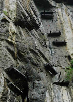 珙县洛表麻塘坝和苏麻湾是僰人悬棺最集中的地方,仅在纵深四千米长的麻塘坝悬崖绝壁上,现存上万个棺桩棺孔;数百具悬棺,是世界上悬棺分布最集中,保存最完好,数量最多的地区,被誉为“世界一绝”、“天然悬棺葬的博物馆”。其悠久的历史,神奇的传说,神秘的文化,独特的葬式,耐人寻味,千古难解。同时,随棺而作的数百幅岩画,色彩鲜艳,栩栩如生;形象地再现了僰人时代的自然环境、社会生产、民风民俗、宗教信仰,令人折服。入口处的“九盏灯”,因传说三根横木上共放有九盏“长命灯”而得名,它前有点将台;右有石船。形如斧砍的石灰岩绝壁上,分布了二十四具悬棺、六十二幅岩画。悬棺神奇绝妙,府瞰万众;岩画题材广泛,内容丰富,牵马放牧,垂钩钓鱼、舞蹈、球戏、踢键娱乐。虽然构图简练,线条粗犷,却富有浓郁的生活气息和鲜明的民族风格。而最远,最高的当数老鹰岩;14具悬棺悬置在110余米的峭壁上,为悬棺精华。而苏麻湾山势巍峨;奇岩峥嵘,河水澄澈清莹,山光水色相映成趣,优美迷人,在距水面50余米的悬崖峭壁上重重叠叠的放有50具悬棺,并留有大量桩孔,给人以奇异神秘的感受。另外,麻塘坝谢家湾,留有一民国建筑一何家大院,已有180多年的历史,占地15亩,全为木质结构,有三座院落,一个花园,二座石碉楼;雕刻精美,巧妙绝伦。