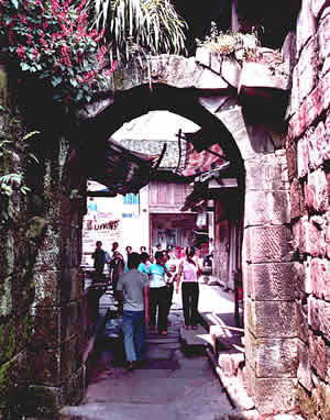 建于明嘉庆二十五年(1545年)的龙华寺,规模宏大,占地约4000平方米;紧挨着的是禹王宫。出下寨门,便于安澜清洪桥,人称凉桥。凉桥原系木板铺就,桥上筑瓦屋形成长廊。桥下流水晔晔,水清见底,两岸除为人们消夏避暑地之外,还是山乡妇女浣纱濯衣处。