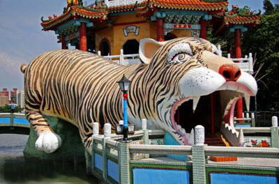 龙虎塔在左营莲池潭的最南端,造形与春秋阁相似,塔身更加高耸巨大,塔前有巨型龙的雕塑,此即著名的龙塔;另有虎塔,塔前有巨型虎的雕塑。看似外形独立,其实两塔内空间可互通,游客由龙口进入后,循梯可直上6楼,游罢则由虎口走出,与一般塔阁大异其趣。其设计独具,造意巧思,有入龙喉出虎口、逢凶化吉之意。