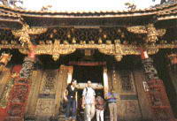 屋顶上剪粘装饰繁复,檐下斗拱金碧辉煌,龙柱则雕工细致;而三川殿门前的青斗石狮,雕刻线条阳刚有力,表情却温驯可人。此外,还有整片石材镂空雕成的石窗、三川殿顶上的层层藻井,都值得细看品味。