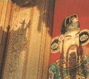 自庙埕进了三川殿门,市街的喧闹立即隔绝在外。黑面长鬓的城隍爷端坐正殿,梁上挂着“理阴赞阳”匾额,清楚说明他的职权。“金门保障”匾额则是光绪皇帝御笔特颁,奖励城隍爷屡次显灵抵御外匪有功。幽暗的庙堂,罗列着文武判官,以及各式面貌狰狞的部将神像,令人心生敬畏。梁上挂着一个偌大的铁算盘,警惕世人善恶终须算总帐。后殿奉祀慈祥的城隍夫人,以及大、二小爷与注生娘娘。