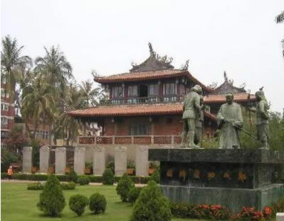 至善园^至德园入口旁的林荫下散置着石桌椅,古人端坐桌前抚琴的石像,生动地诠释出幽篁琴啸的情景。步径穿过奼紫嫣红的九重葛花棚与枝叶浓密的老榕树,行来倍觉清爽;池塘里睡莲、荷花争相绽放,沿着堤岸步上曲桥,彷如踏入莲花田,花姿随风摇曳,引人垂怜。