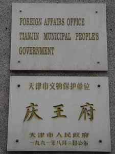庆王府位于和平区重庆道55号,现为市政府外事办公室使用。占地面积4385平方米,建筑面积5085平方米。该建筑为带地下室三层砖木结构小楼。其立面二层外用类似爱奥尼克柱围成柱廊,栏杆用黄、绿、紫三色相间的六棱琉璃柱围成。平面为长方形,中央为方形大厅,设一座可拆卸的小戏台。一、二层大厅周围有列柱式回廊,四周为居室,各厅之间木雕隔段,顶棚有精美雕饰。第三层的八间房是供奉祖先的影堂。院内有大花园,设假山、石桥、亭子,景致宜人幽雅。