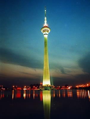 天津广播电视塔,位于天津市河西区聂公桥南、紫金山路与津溜公路汇合处,取其首尾二字,所以简称“天塔”。塔身高415.2居当今亚洲之冠,跻世界高塔之林。它于1991年建成,耸立于碧波与云霄之间,是世界上唯一一座“水中之塔”,其势如剑倚天,享有“天塔旋云”之美称。