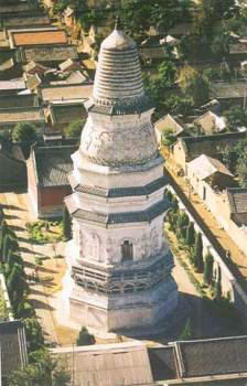 此塔下部为密檐塔型,上部砌作覆钵式,是中国辽塔造型奇特之一例。1976年大地震,塔身震损,通体酥裂,1983年大修加固。