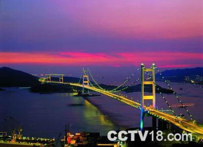 青马大桥是为了赤蜡角机场而建的十大核心工程之一,可算是世界级建筑,它横跨青衣岛及马湾,全长2,160公尺,主桥跨度也达1377米,两座吊塔,每座高206米,离海面62米,是全世界最长的行车、铁路两用吊桥。1992年,青马大桥开始建造,仅以五年时间完成,称得上是同类建筑中花最短时间。它与连接马湾、大屿山的汲水门大桥一起,像两道彩虹,成为香港新的观光景点。它的壮观恢宏的气势完全超越了美国的金门大桥。