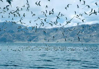 高原上的淡水湖泊生机蓬勃,这里聚居着大量红嘴鸥和斑头雁,偶尔会在湖边出现罕见的野马群。湖中心有著名的鸟岛,一到夏季,就有数以万计的地中海中头鸥来此繁殖。可以租船在湖中游览,也可以上鸟岛看成片的鸟窝、鸟蛋,观赏海鸥和斑头雁。需要提醒的是,岛上的鸟蛋是受保护的,绝对不可以带走。
