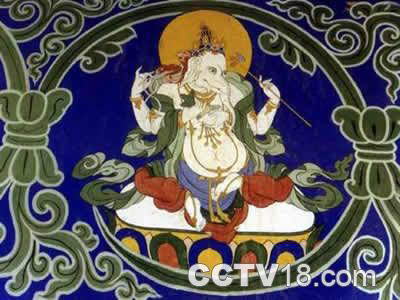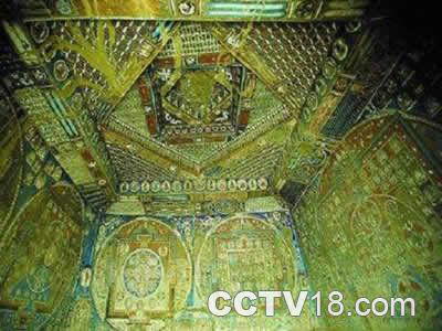 壁画已有较重的烟熏和驳蚀,许多小圆佛像被人掏成一个个小墙洞,但是壁画的各种形象图划,大致尚能辨认出来。壁画中"坛城"比较多,左右两边墙上是外圆内方的坛城,似乎属于佛教的;正中墙上却是一个大圆中并排着三个小圆的坛城,这似乎属于本教的。洞门左右两侧有较大的菩萨佛像。其他还有许多贴画到墙壁上的小圆佛像。顶部中心是个莲花瓣,莲花四周都是列队排阵的小圆佛像。在坛城四角的两旁边线上,都配着人物画像。这些人物中有阿里地区"谐巴谐玛"的舞蹈形象,有戴大圆白礼帽男人和佩戴头饰的女人形象,洞门左侧墙上,则有五六个地狱饿煞鬼的变形裸体人像,与一般西藏寺庙中饿煞鬼"意达"形象有不同。