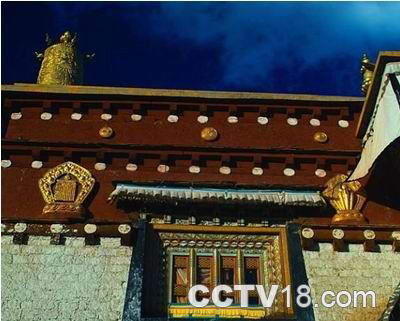 小昭寺主楼三层,底层分门庭、经堂、佛殿三部分,周围是转经廊道,廊壁上遍绘无量寿佛像。顶层是汉式金瓦,金光闪闪,凌空摩天,拉萨各个方位均能看到,蔚为壮观。