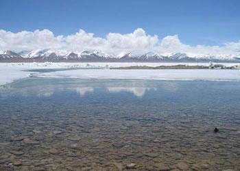 神湖纳木错位于拉萨市当雄县和那曲地区班戈县之间,湖面海拔4718米,从湖东岸到西岸全长70多公里,由南岸到北岸宽30多公里,总面积为1900多平方公里,是我国的第二大咸水湖,也是世界上海拔最高的咸水湖,最深处约33米。纳木错东南部是直插云霄、终年积雪的念青唐古拉山的主峰,湖水靠念青唐古拉山的冰雪融化后补给,沿湖有不少大小溪流注入,湖水清澈透明,呈天蓝色,水天相融,浑然一体。广阔的草原绕湖四周,天湖象一面巨大宝镜,镶嵌在藏北的草原上。湛兰的天、碧蓝色的湖、白雪、绿草、牧民的牛毛帐篷及五颜六色的山花,交相辉映,组成一幅大自然美丽、动人的画面,身临其境,无不感到心旷神怡。闲游湖畔,似有身临仙境之感。