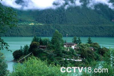 岛上又有一小巧玲珑面积不足200平方米的寺庙,名为“错宗工巴寺”,始建于吐蕃赞普时期,是宁玛派寺庙,距今已有1500多年的历史了。庙内主供莲花生,在一尊大威德金刚塑像脚下,有两块天然鹅卵石上面有一凹进的圆窝,传说是格萨尔王征战此地时战马留下的蹄印。另外在这个不大的小岛上的其他地方,也密布着许多神奇传说:格萨尔王挥剑于石头上留下的剑痕、树叶上有自然形成的藏文字母的“字母树”、松藏干布在石上留下的足印、莲花生洗脸的神泉……林林总总让人不由得对这充满神迹的小岛顿生景仰之心。