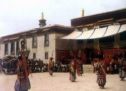1908年第十三世达赖喇嘛土登嘉措从北京返藏途经那曲镇在孝登寺住了一个多月,同主康仁布钦活佛我会晤,并指示:从藏历木虎年开始,孝登寺每年藏历1月4日举行传召法会,所有僧众可以享受拉萨传召法会的待遇。还指示孝登寺喇嘛不得少于300人。该寺除按宗教仪轨定期举行传召法会外,不在每年的8月举行大型的宗教舞蹈“羌姆”。孝登寺的“羌姆”最有特色,称“杰羌姆”和“久松羌姆钦”。“杰”意为“八”,“羌姆”意为“跳”或“舞”,因是8月表演的一种羌姆,故称“杰羌姆”。“久松”意为“13”,“钦”意为“大型”或“正式”,因是13日正式表演的一种大型宗教舞蹈,当地人称“久松羌姆钦”。藏历8月2日不穿羌姆服饰表演的称“德布拉”即轻便的意思,实际是内部排练;8月8日穿羌姆服饰表演的称“杰养羌姆”;8月13日穿最好的服装道具正式表演的称“久松羌姆钦”,届时附近群众到寺观看。