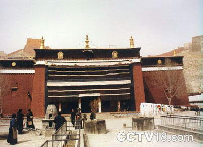 寺内的措钦大殿已经有差不多500多年的历史了。经堂的正殿供奉三世佛,它的两侧还有东、西净土殿。因为要兼容花、白、黄三教,因而全寺塑像的风格也不同于别处,此殿表现最为明显。经堂西北有一尊强巴佛的鎏金铜像,高有8米,据说是用14000公斤黄铜铸成的。殿高3层,底下是48根立柱的大经堂,立柱上挂满了年代久远的丝织唐卡佛像。措钦大殿的二层是拉基大殿,全寺最高级别的“拉基会议”就在这里举行。周围还有几间佛殿,觉登殿里的一尊直径3米的立体坛城与东厢殿里的文殊菩萨和十八罗汉塑像,都已经有500年的历史了。在三层,有座叫夏耶拉康的佛殿,殿内的坛城壁画颇有名气,六菱圆形的莲花藻井也属罕见。