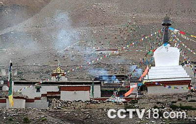 整个绒布寺依山而建,一共五层,现在仍在使用的只有两层。据说当初之所以把寺庙建得这么高,主要是图这里清静,便于休息。不过由于珠穆朗玛峰近些年来旅游越来越热,庙里的喇嘛们想清静也清静不起来,寺外白塔下的玛尼堆是当地佛教信徒们为自己祈求好运的一种形式,而现在,十字架和英文也出现在这里面。