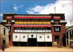 老大殿:由强巴朗杰创建。门向东,高二层。底层由前廊、经堂、佛殿三部分组成。前廊有柱2根,廊前壁画彩绘四大天王。经堂面积4柱,主供释迦牟尼佛及二弟子泥塑像,主尊高约1.8米;经书架上供放《甘珠尔》一套。佛殿面积2柱,殿内主供强巴佛泥塑像高约5米,面目慈详雍容大度;其左右供奉无量寿佛和莲花生泥塑像,甚为精美。大殿上层为活佛居室。