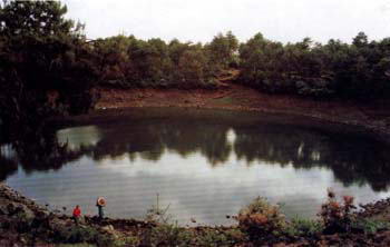 三座“空”字号的火山均兀立在腾冲县城西10余公里的马站乡境内,远远望去,酷似三只倒扣的巨钵,山山相距约五六百米,由北面南一字排开,与雄峙西南的打鹰山遥遥相对。黑空山居北,相对高度约200米,山体上松林茂密,一派墨绿生机。其东西两面横荡着一条绵延数里的玄色石带——那是冷却、凝固了的来自地底的熔岩。相比之下,居中的大空山就显得荒凉一些,它比黑空山略低,无高大树木,但视野却很开阔,四周均是当年喷发后形成奔流状熔岩积滞石滩,空寂苍凉,上面荒草萎萎,有些恍人心神;小空山高仅50来米,但火山口却大得出奇,直径150米有余,且深达70米。浑圆的锥体空空洞洞,看似无物,却盛满了大自然的无穷奥秘。