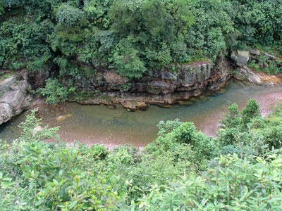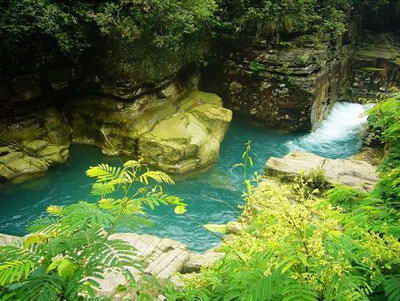 有台头只见一线天的深渊,有奇形怪状似人似兽的奇岩怪石,有依岩就势大自然鬼斧神工的壁画,栩栩如生,俯视猛浪若奔、奇花异水的钟乳石,还有令人心惊寒战的瀑布,由悬崖跌入深潭,再由深潭浩流跌入悬崖,如蛟龙翻滚,穿峡转谷,形同摔碎一块巨大翡翠,飞花似玉,湍流直泻,形成浩大水帘响声震耳,回荡山谷。