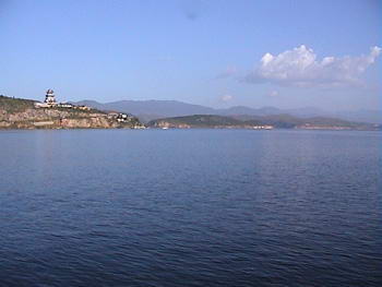 金梭岛是苍洱三岛中最大的岛,四面临水,高出水面约250米,南北长约800米,东西宽约100多米,中部低而南北偏高,形似一支织布的梭子,故名金梭岛。据《蛮书》记载,南诏王曾在岛上建避暑行宫,所以至今还能见一些残砖断瓦。由金梭岛往北约10公里,是一座秀丽的小岛玉矶岛,小岛高出海面只有4公尺左右,全岛似一块巨大的岩石构成,伫立水中,恰似天外飞来。岛上还建有观音阁,因此又有“小普陀”之称。