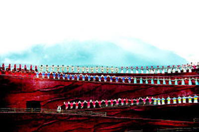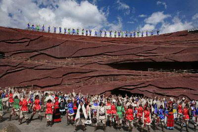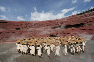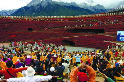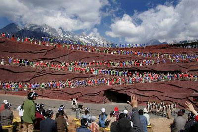 《印象丽江》大型实景演出,由著名导演张艺谋、王潮歌和樊跃共同执导。《印象·丽江》雪山篇将剧场设在海拔3100米玉龙雪山的怀抱里,四周高山草甸、白云缭绕,将观众带到了雪域高原天人合一的纯美背景中。在可容纳1200余人的360度全视角剧场中,用象征着云贵高原红土的红色沙石砌成了12米高、迂回艰险的“茶马古道”。