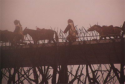 云南的马都是矮脚的马,这种马跑不太快,却很善于走山路。只有这种好脚力的马才能驮着沉重的货物,走过漫长艰险的茶马古道,走过连折12层而上,仅一尺多宽的马帮路。因此纳西人十分推崇马,马是他们的崇拜物之一。马帮在红顶上奔跑,仿佛是六百年前茶马古道上“山间铃响马帮来”的震撼再现。