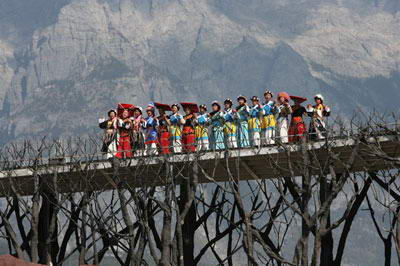 茶马古道给人一种行走在天上的感觉。。。。。。丽江古城成为滇西茶马古道上的重镇,都是因为马帮的原因。马帮影响着纳西人的生活,他们以能参加马帮,当上马锅头为荣。马鞍舞展现了大马帮男人的英雄色彩。