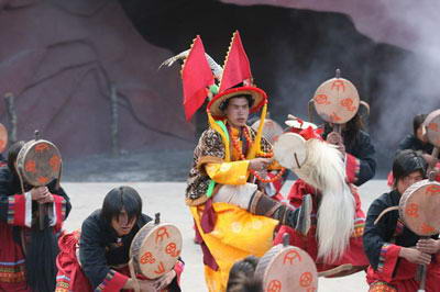 纳西人是天的儿子,纳西人是自然的兄弟。对天的崇拜和对自然的亲和是纳西人从古至今所一直推崇的。这个人口不到30万的民族,在东巴经书中曾经这样记录:“我是九天先祖的后代,我是七地先宗的后代,越过九十九座山不累者的后代,猛师壮象的后代,力大无穷的巨人的后代,口含竹纳乱卵神山不嫌重者的后代,大江大河吸干后不解喝者的后代,三袋炒面一口吞下不呛的后代,三根腿骨一口咬断牙不碎者的后代,身经百战而不死者的后代。。。。。。”在震撼人心的鼓声中,在老东巴振振有词的唱经声中,我们仿佛已经感受到了一个生生不息的纳西民族。