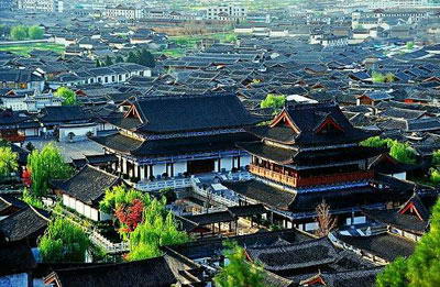 在狮子山极目下望,古城栉次鳞比的民居瓦房呈现出一片与天地混融的黛青色,苍苍茫茫宛若一幅巨大的水墨画。 木土司的府第虽有王者气度,却一反中原王城“居中为尊”的传统,将府第建于城南一隅。而作为全城中心的则是商贾云集的四方街,纵横交错的街道从四方街这一商贸中心向四面八方辐射。