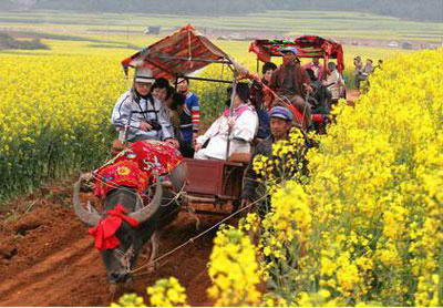 登山远眺,可以看到花海中,玉带湖、腊山湖、湾子湖象三面银光闪亮的镜子,衬托着山色青翠的白腊山;油菜花海里,村落点点,寨子棋布;此起彼伏的喀斯特锥形山,点缀花海中,有如人间仙景,构成绝妙的图画;牛街石岩溶洼地,是喀斯特岩溶中的一种典型地貌,呈现出别致的“千丘田”田园风光;一年一度的油菜花旅游节,向海内外游客发出春天的邀请,吸引了无数海内外朋友到罗平观花、尝鲜蜜。