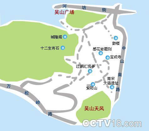 吴山景区,西起万松岭,东到鼓楼,山体蜿蜒起伏,绵亘数里,直插市区。当西湖还是一个与钱塘江相连的海湾时,吴山是环抱这个海湾的一个岬角。沧桑变迁,吴山成了一座风景名山,左江右湖,是登高远眺,纵览西湖风光的最佳之地。
