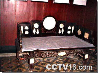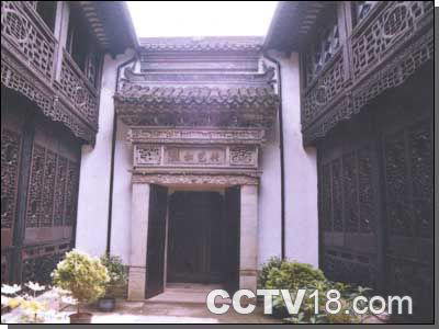走过门厅即为内厅,江南一带又称轿厅(过去是停歇轿子的地方)。厅后两侧有两天井供采光通风。两侧墙面镶嵌石雕四块是福禄寿三星和八仙过海。有腰门与后进相通,正大厅腰门砖雕精致,门额“竹苞松茂”为名人吴淦楷所书。